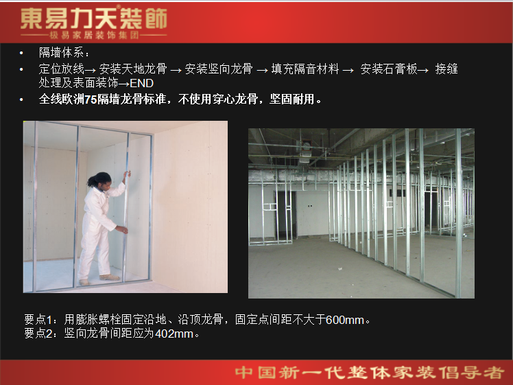東易力天裝飾 標(biāo)準(zhǔn)吊頂工藝 1.石膏板與龍骨應(yīng)用螺釘固定,釘與板邊距離:紙包邊宜為10~15mm,切割邊宜為15~20mm;板周邊釘距宜為150~170mm,板中釘距不得大于200mm; 2.龍骨與龍骨連接應(yīng)